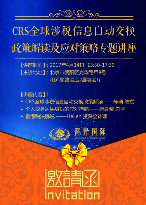 鑒于CRS與我司客戶的利益息息相關,今年,我司特意在北京、上海、深圳等地安排了多場CRS專題講座。4月14日,晉昇國際將在北京舉辦2017年第三場CRS專題講座,有興趣的朋友趕快報名參加我們的講座活動吧!