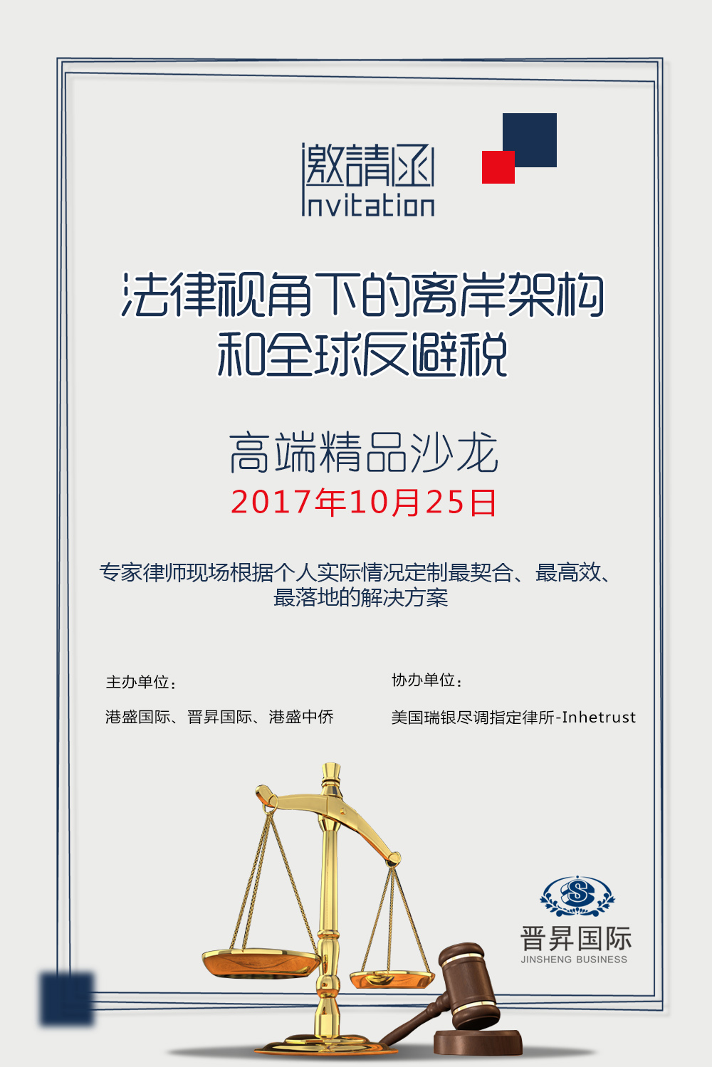 為了讓大家能夠從的法律視角了解全球反避稅趨勢、離岸架構(gòu)搭建新策略、境外稅務(wù)合理籌劃等內(nèi)容,我司整合實力雄厚、知名的律所資源,10月25日,將聯(lián)袂國際財富規(guī)劃聯(lián)盟(IWP)成員、美國瑞銀盡調(diào)推薦律所-Inhetrust重磅推出"法律視角下的離岸架構(gòu)和全球反避稅"精品沙龍。