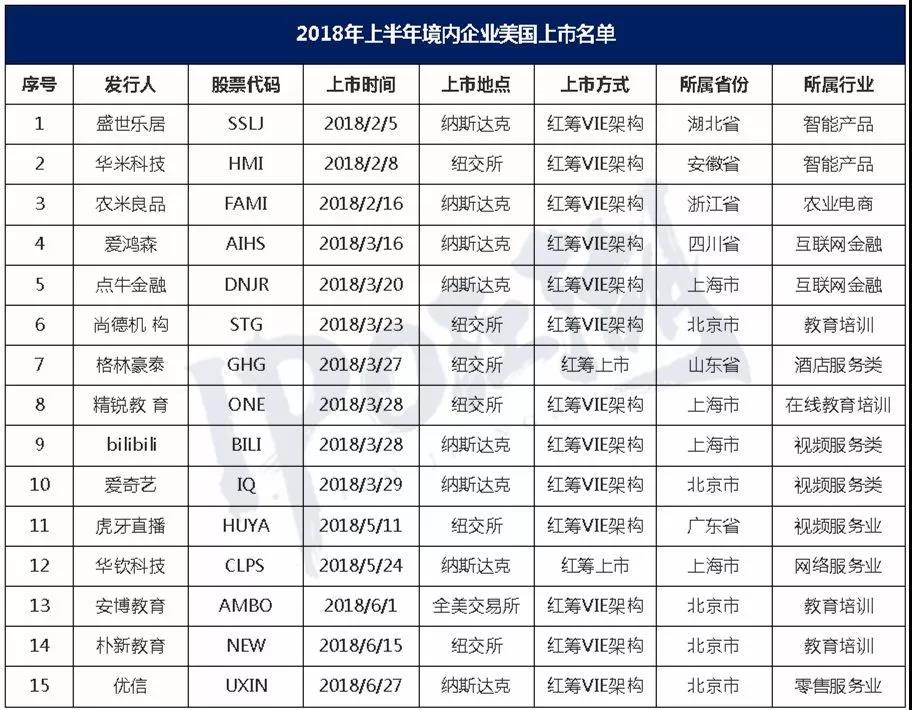 2018 年上半年,共有15家中國(guó)企業(yè)赴美上市。