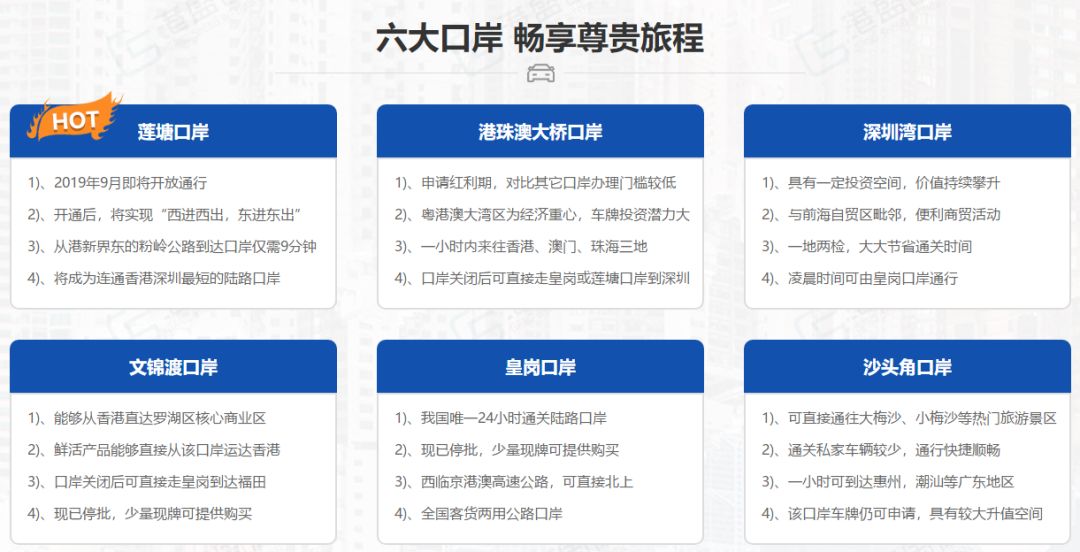 引入相關(guān)城際軌道線(xiàn)路,實(shí)施站城一體化開(kāi)發(fā),皇崗口岸目前正在構(gòu)筑一個(gè)跨境樞紐,未來(lái)交通只會(huì)更為方便,甚至可能成為中國(guó)香港連接大灣區(qū)的重要樞紐,隨著皇崗口岸的周邊配套的愈加完善及在深港創(chuàng)新特別合作區(qū)的助推下,不難預(yù)測(cè),未來(lái)皇崗口岸的粵港車(chē)牌價(jià)值將重估,對(duì)有需要辦理粵港車(chē)牌的客戶(hù)來(lái)說(shuō)無(wú)疑是一個(gè)搶先辦理的好時(shí)機(jī)。