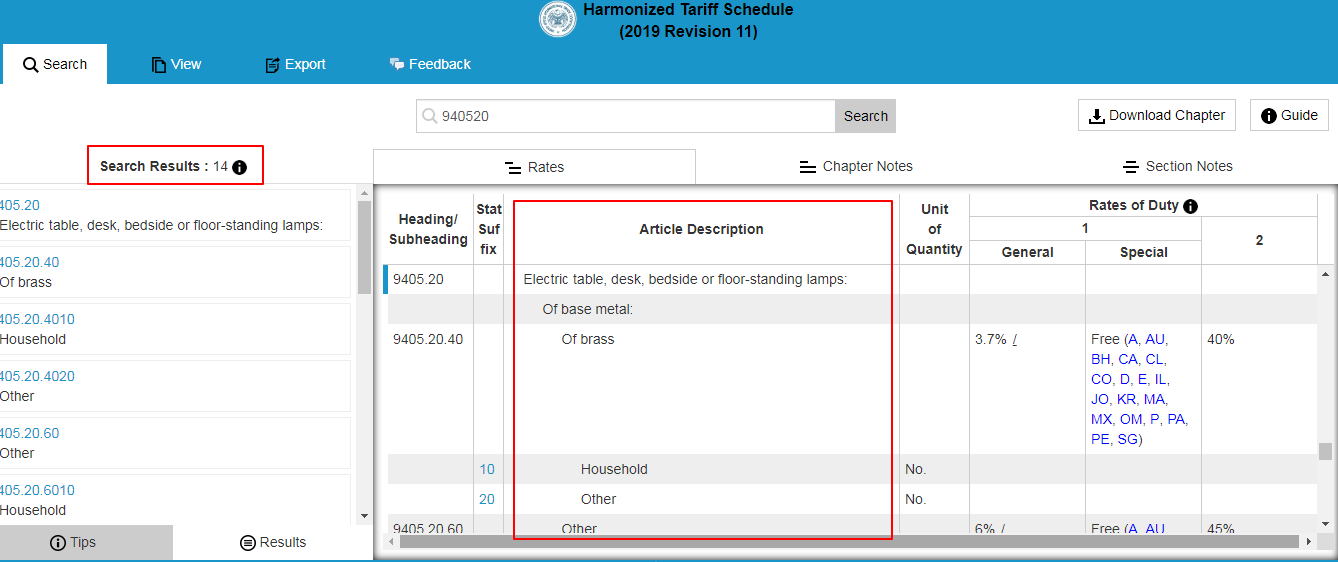 進(jìn)入上述網(wǎng)站,在搜索框中輸入中國HS CODE的前六位數(shù),如臺(tái)燈940520****,根據(jù)產(chǎn)品描述選擇準(zhǔn)確的HTS CODE。