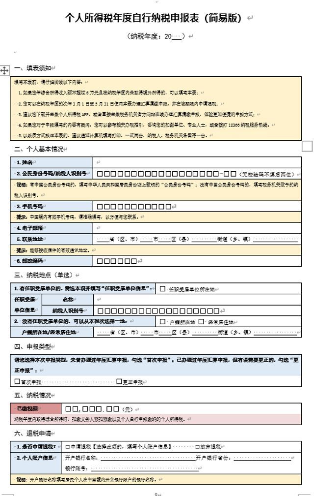其中,A表還包含簡(jiǎn)易版,此表格不需要填列扣除項(xiàng)目,僅就個(gè)人基本情況、申報(bào)類型、納稅地點(diǎn)、已繳稅額等情況作出說(shuō)明即可。