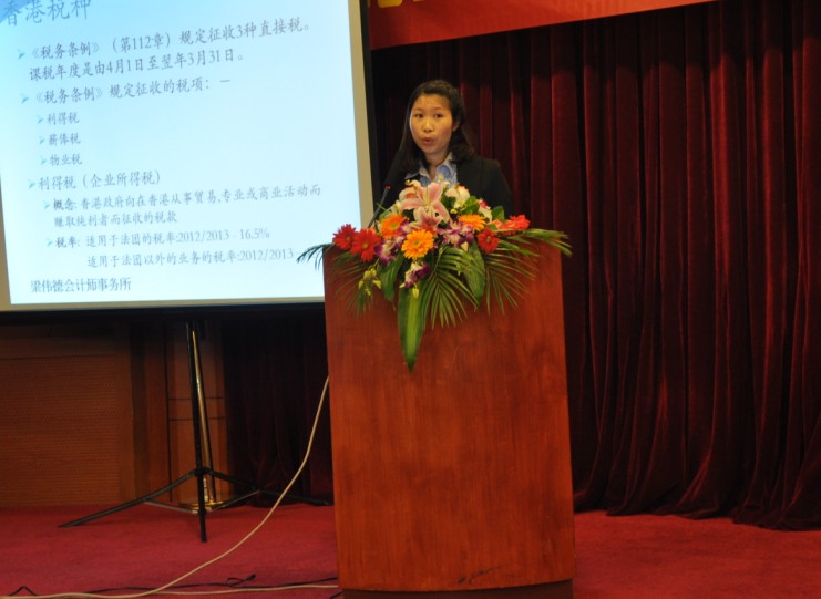 在陳老師此次課程結(jié)束之后,緊接著便是眾多客戶尤為關(guān)注的涉外稅收籌劃課程培訓的內(nèi)容了,在稅收問題上一直是投資者、企業(yè)家、商戶們極為頭疼的問題,而本次稅收籌劃課程內(nèi)容講師是中國香港梁偉德會計師事務所的涉外稅務稅收專家TINA趙小姐,TINA用她豐富的經(jīng)驗和的結(jié)合對中國香港稅種-稅率-計稅方法/零申報的申報及條件/做賬報稅的條件/交稅情況及如何申報利得稅/中國香港公司做賬報稅的周期/中國香港利得稅征收原則及15個需要考慮的問題/如何準備做賬單據(jù)等方面做出了詳細的講解。(下圖為TINA女士在講臺上進行講解申報利得稅內(nèi)容)