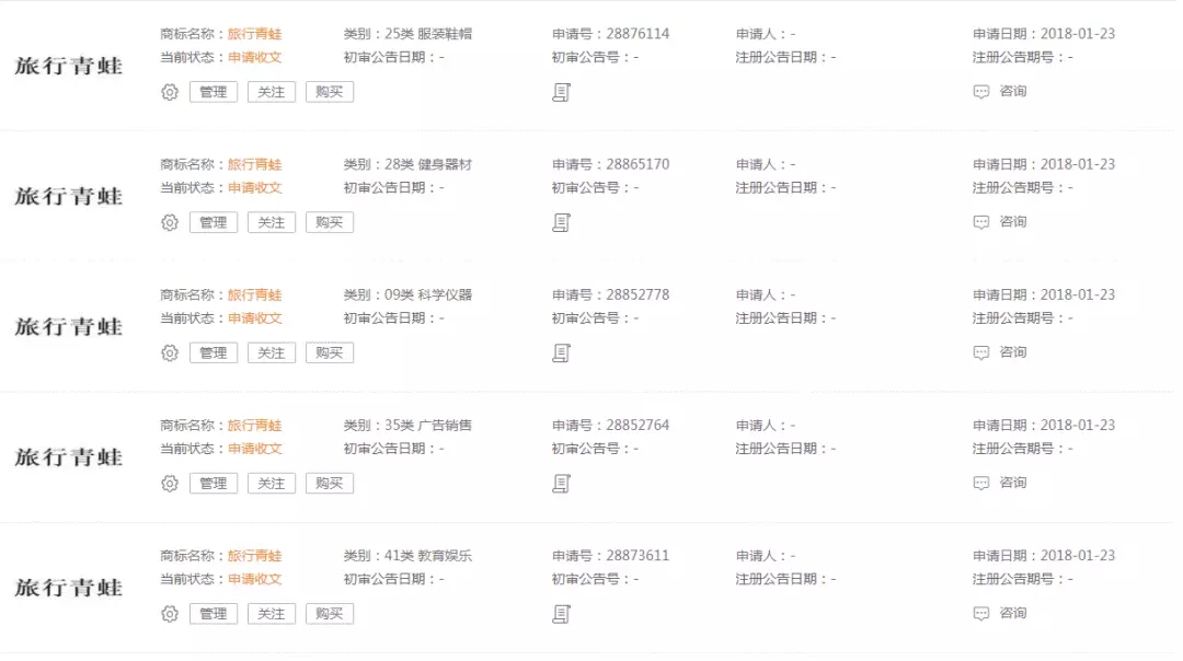 通過商標(biāo)檢索發(fā)現(xiàn),已有人于1月23日,率先在第9類等類別申請注冊了"旅行青蛙"商標(biāo)。因?yàn)椴荒塬@知第9類商標(biāo)注冊申請人的基本信息,因此目前第9類旅行青蛙商標(biāo)注冊申請人是否為HIT-POINT公司還是個(gè)迷。