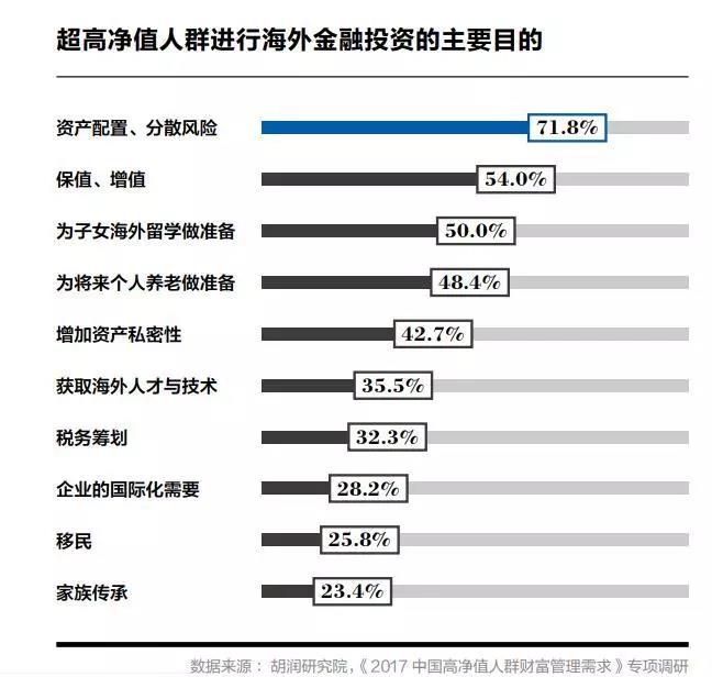 “資產配置、分散風險”是超高凈值人群進行海外金融投資的最主要目的,占比高達71.8%;其次是財富的“保值、增值”、“為子女境外留學做準備”和“為將來個人養(yǎng)老做準備”。