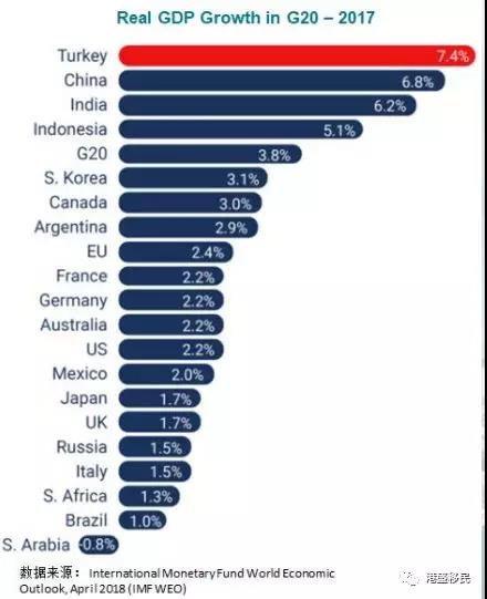 2003年-2017年,土耳其經(jīng)濟(jì)經(jīng)歷了15年的高速發(fā)展。在2017年OECD對G20成員國GDP實(shí)際增速的統(tǒng)計(jì)中,土耳其以7.4%的增速位列之首。2018年GDP排名18,超過瑞士(20)和中國香港(35)